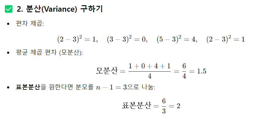 예시로 2, 3, 5, 2의 데이터를 분산, 표준편차를 나타내면 (분산 사례수 n 로 나누지 않고 n-1로 나눔)