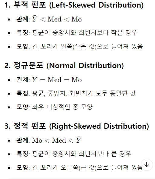 왜도 0 = 정규분포, 왜도 음수이면 부적편포, 양수이면 정적편포