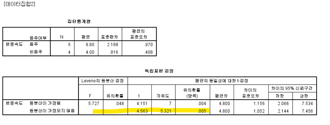 ◼ 등분산 가정 (두 독립표본 t검증의 경우)