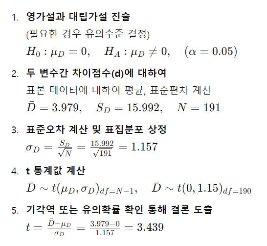 ◼ 실제로는 두 모집단의 평균 비교가 아니라 짝지어진 두 자료의 차이점수에 대한 검증으로 간주