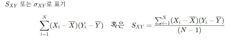 - 두 변수가 동시에 변하는 정도로, 한 변수가 얼마만큼 변할 때 다른 변수는 얼마만큼 변해가는 지의 정도를 X와 Y의 평균 (𝑋̄, 𝑌̄)을 기준으로 계산