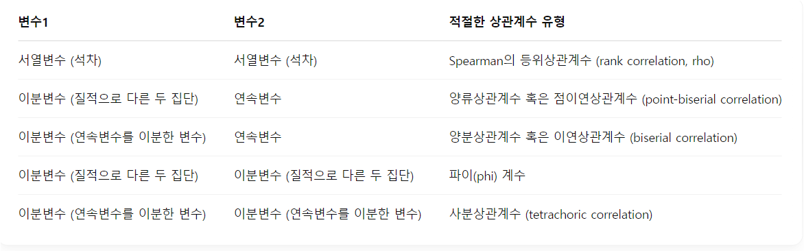 - 두 변수 모두 이분변수인 경우, 이 두 변수에 대해서 Pearson의 적률상관계수 공식을 직접 적용