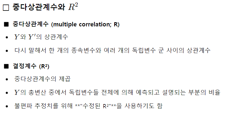 - 여러 개의 독립변수를 사용하여 한 개의 양적 변수인 종속변수를 설명, 예측하기 위한 통계모형