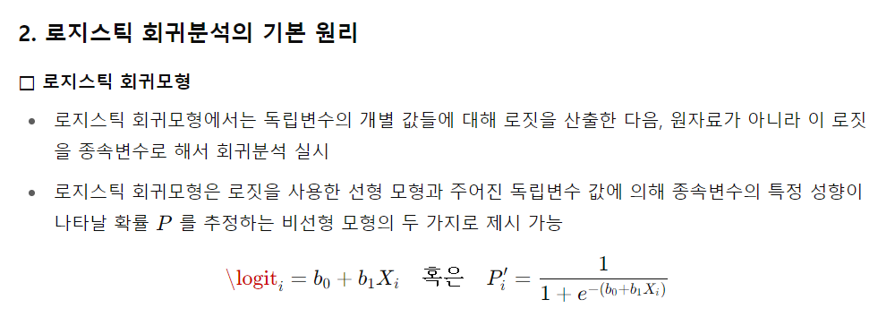 - 종속변수가 0/1과 같은 두 가지 값을 갖는 범주변수인 경우