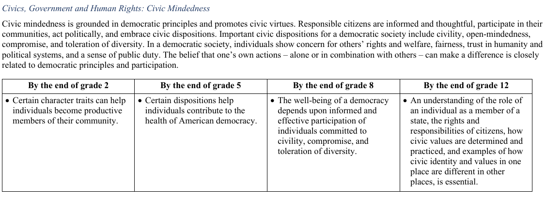 또한, 학생들은 6.3 표준(21세기 적극적 시민의식)에 명시된 성취 기대사항을 충족하거나 초과 달성해야 합니다. 이 기대사항은 학생들이 현대 국내외 문제를 해결 지향적 관점에서 다루는 능력을 기르는 데 중점을 둡니다.